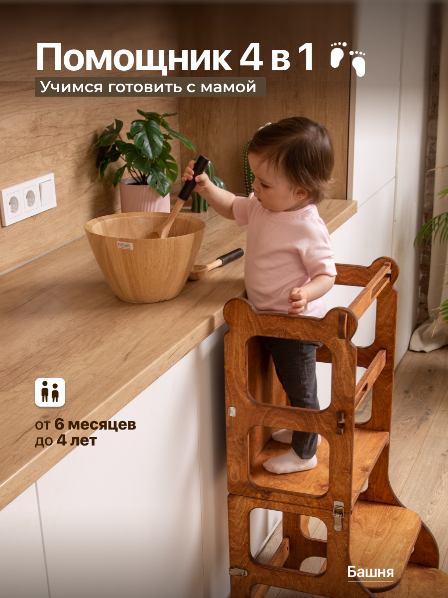 Очень нам понравилась башня помощница. Теперь все даваем вместе с дочкой. Режем салат, моем посуду, завариваем кофе Маме. Дочке 1,5, сама залазит и сама слазит с неё. Рекомендую