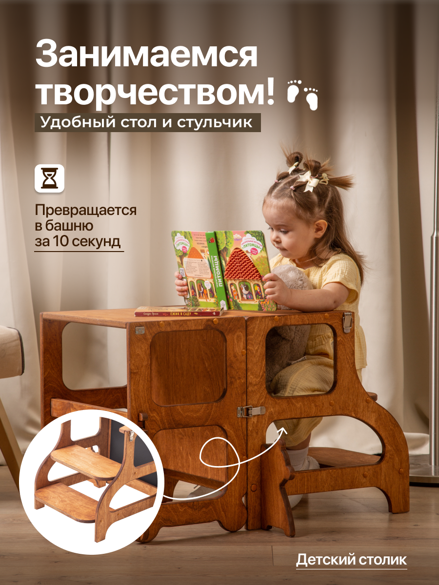 Башня превращается в столик и стульчик: верхняя часть откидывается и прикрепляется к нижней части. Таким образом ребёнок сидит на нижней ступеньке, а верхняя ступенька служит столиком.