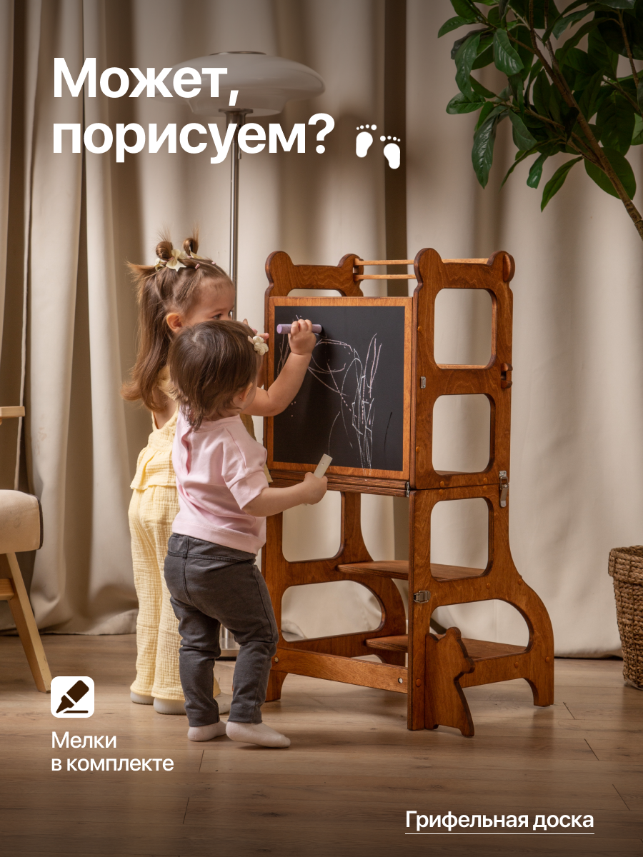 Долго думали что дарить малышу на год, и решили купить башню помощника! Отличный девайс! Малышу интересно смотреть, что делает мама за кухонном столе, будет старше будет помогать, тем самым развиваться)Так же малыш учиться забираться и у них это ловко получается! Будет постарше будет удобно сидеть за столиком в любом месте и заниматься своими делами! Ну и доска как бонус, даст малышу проявить свои качества художника!)))