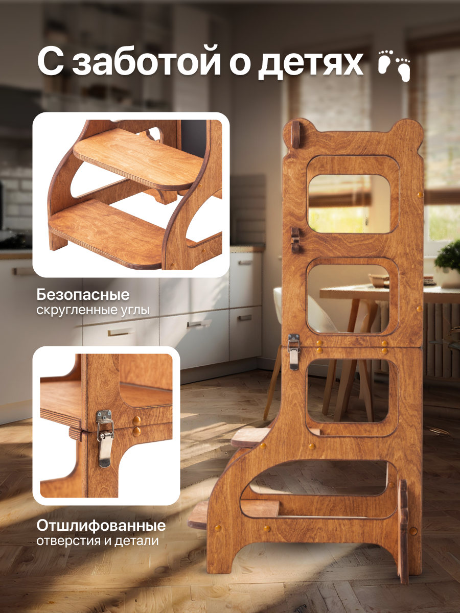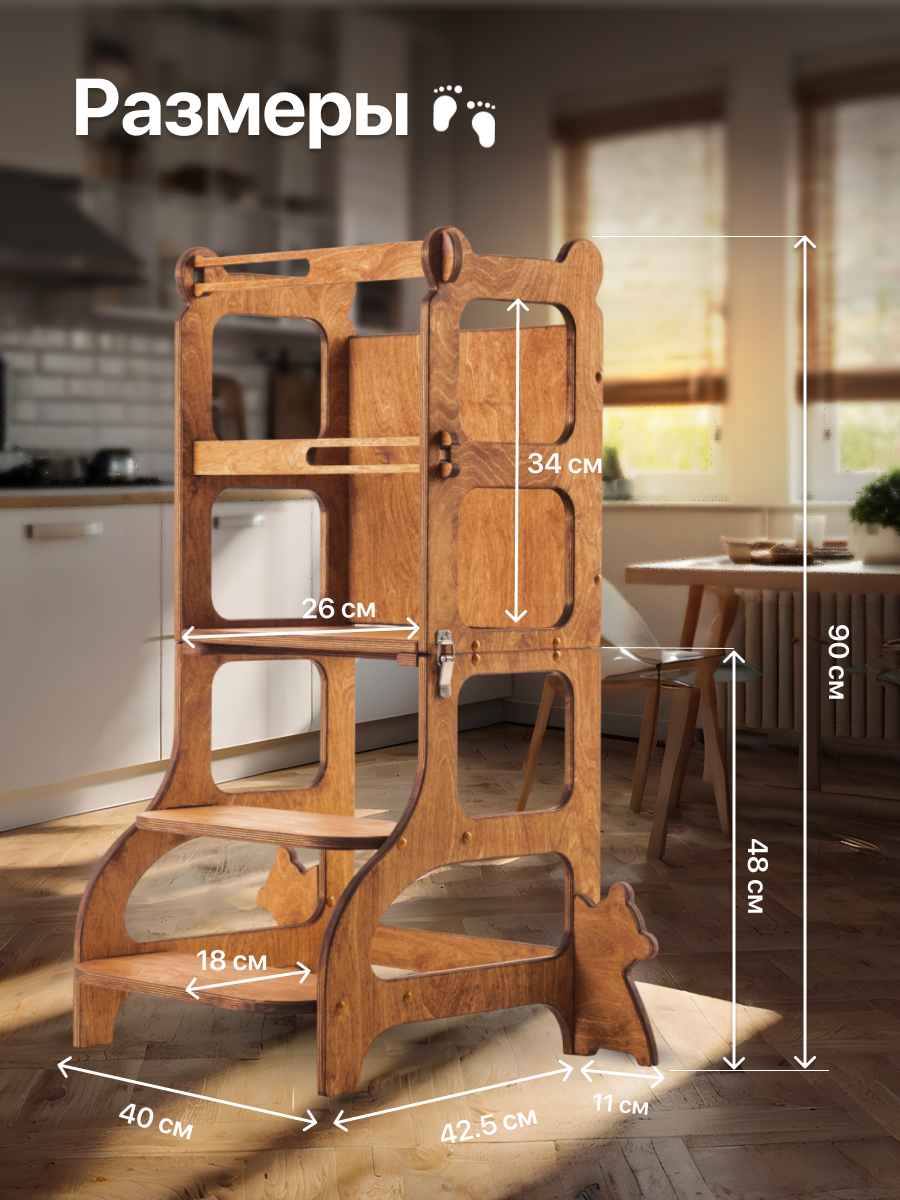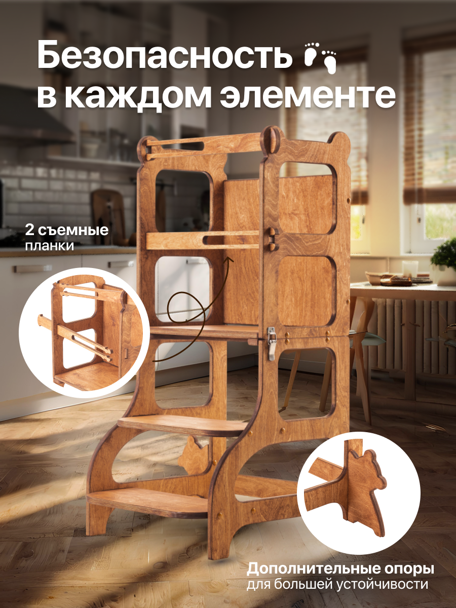 Хорошая башня, ребенку 1.3 понравилась, сам научился залезать. Удобно готовить и показывать ребёнку, занимать тут же на столешнице. Столом и стулом пока не пользовались, но в дальнейшем планируем. Но оставлять без присмотра все же не стоит.