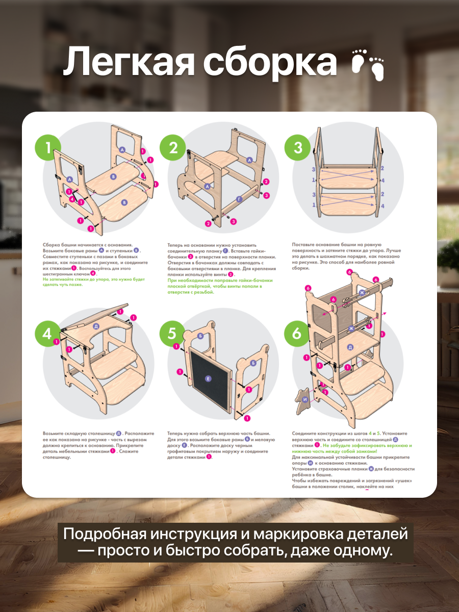 Вкладываем подробную красочную инструкцию и маркируем детали — вы сможете быстро собрать башню без посторонней помощи.