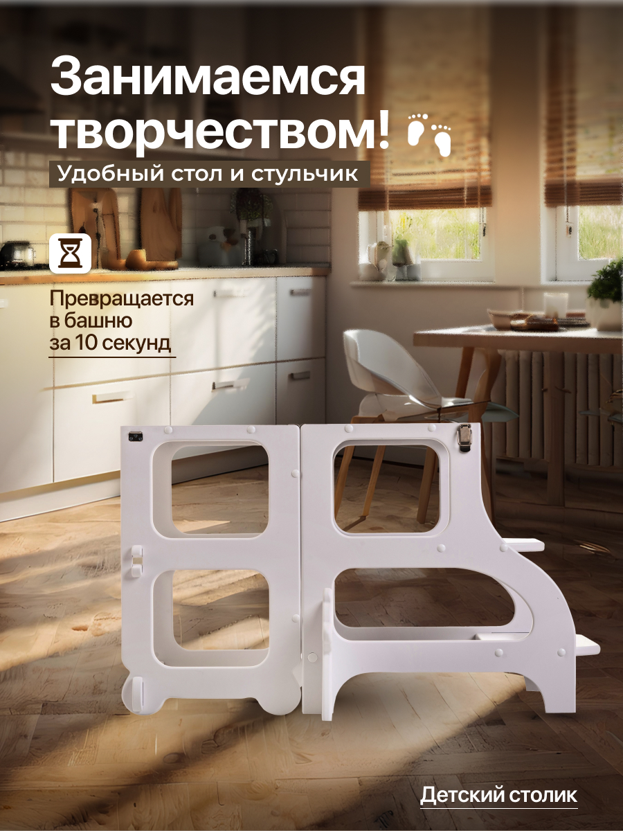 Башня превращается в столик и стульчик: верхняя часть откидывается и прикрепляется к нижней части. Таким образом ребёнок сидит на нижней ступеньке, а верхняя ступенька служит столиком.