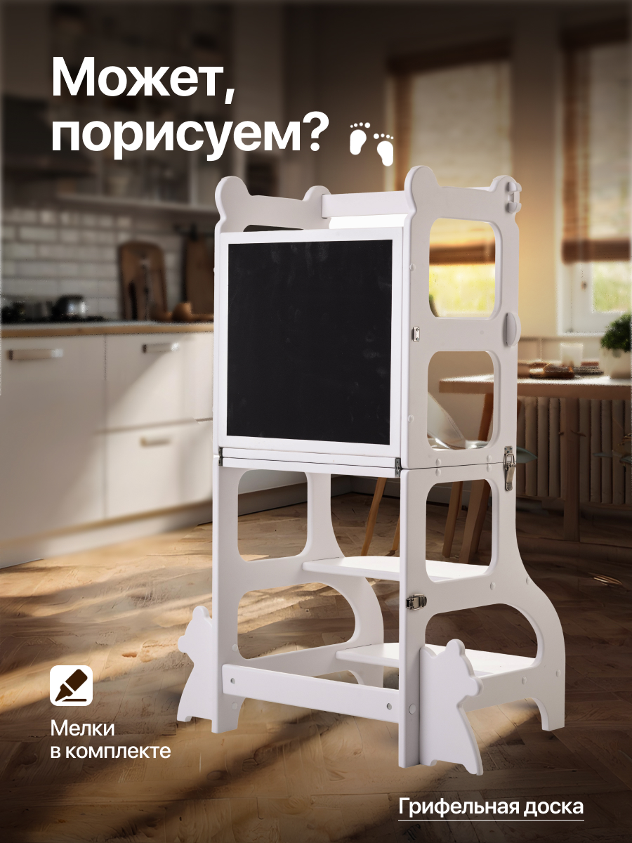 Долго думали что дарить малышу на год, и решили купить башню помощника! Отличный девайс! Малышу интересно смотреть, что делает мама за кухонном столе, будет старше будет помогать, тем самым развиваться)Так же малыш учиться забираться и у них это ловко получается! Будет постарше будет удобно сидеть за столиком в любом месте и заниматься своими делами! Ну и доска как бонус, даст малышу проявить свои качества художника!)))