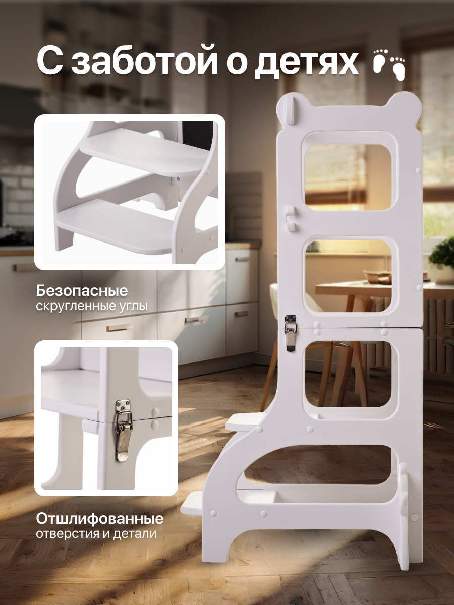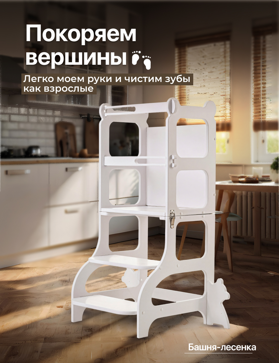 приобрели своему годовалому ребенку башню, и мы и ребёнок в восторге, используем как на кухне,так и в ванной, а так же, что бы в окно посмотреть. Башня очень устойчивая, ребенок сам ее перемещает по квартире.