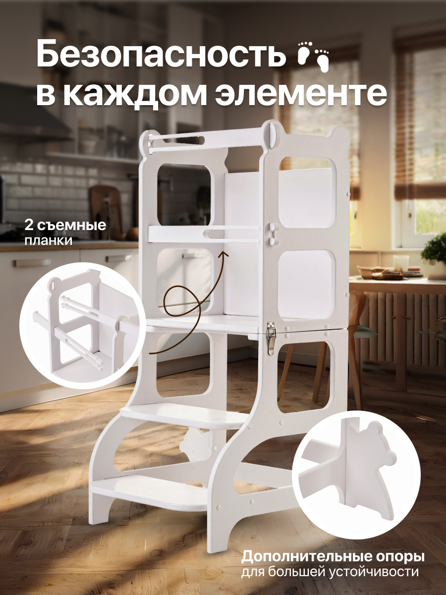 долго выбирала, есть варианты похожие дешевле, но опираясь на отзывы решили не экономить. Башенка устойчива, зацепы очень надежно крепят башню, ребенок без труда с интересом забирается сам. Наконец не нужно держать на руках стобы умыть и почистить зубы. Так же за столом сидим занимаемся с большим удовольствием, доска для рисования тоже очень понравилась, учимся рисовать и вытирать трапочкой за собой. Огромное спасибо производителю за отличное качество!