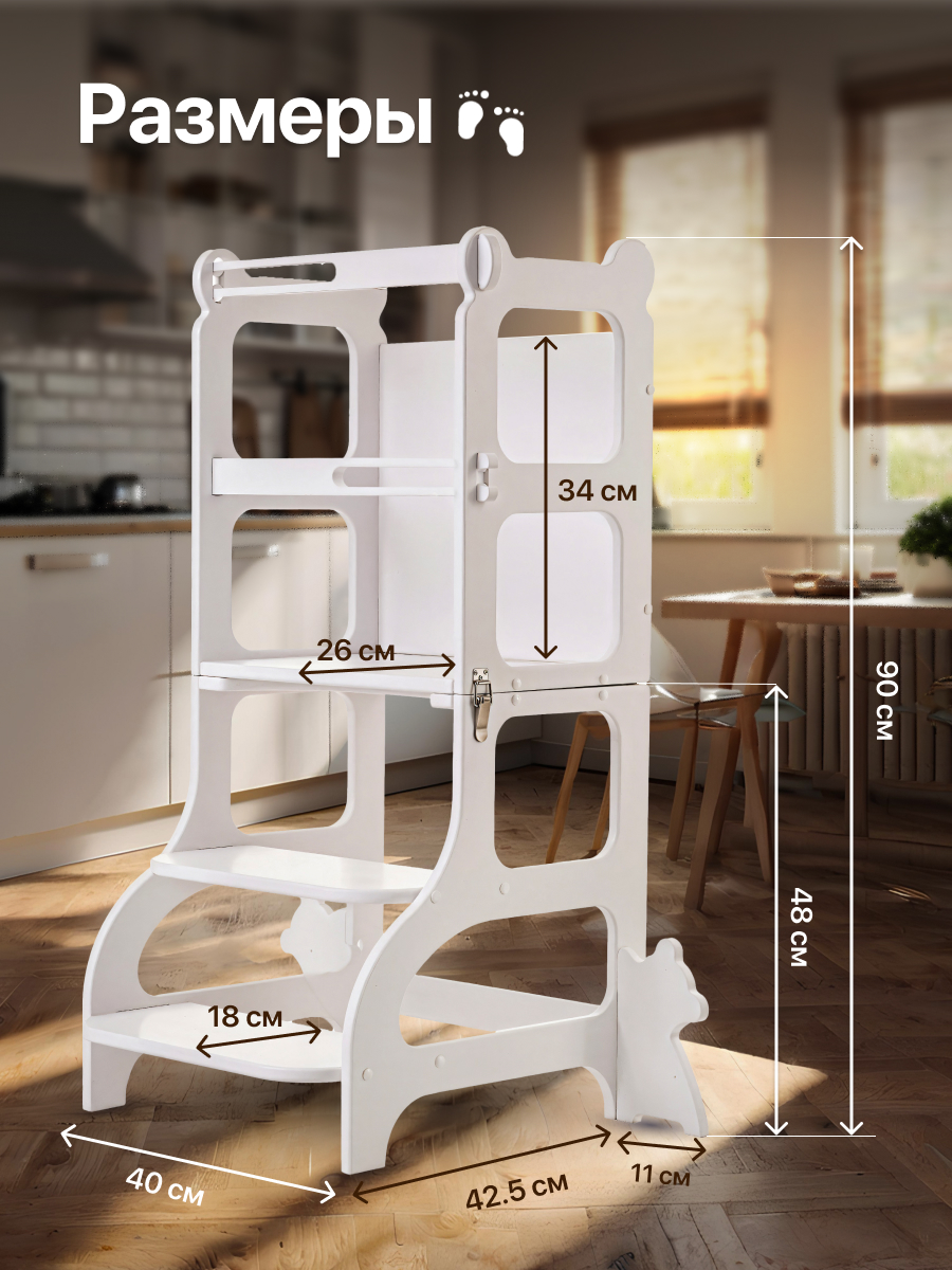 Хорошая башня, ребенку 1.3 понравилась, сам научился залезать. Удобно готовить и показывать ребёнку, занимать тут же на столешнице. Столом и стулом пока не пользовались, но в дальнейшем планируем. Но оставлять без присмотра все же не стоит.