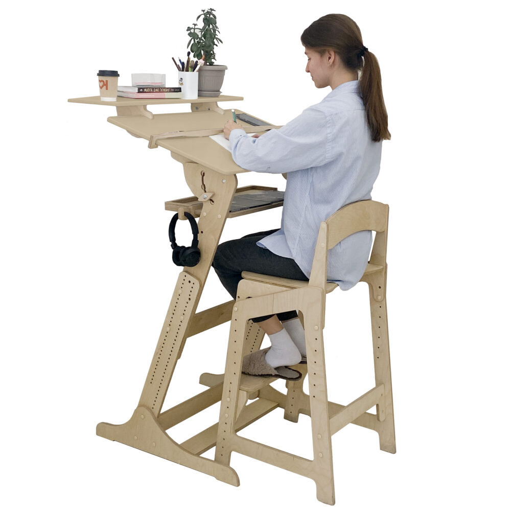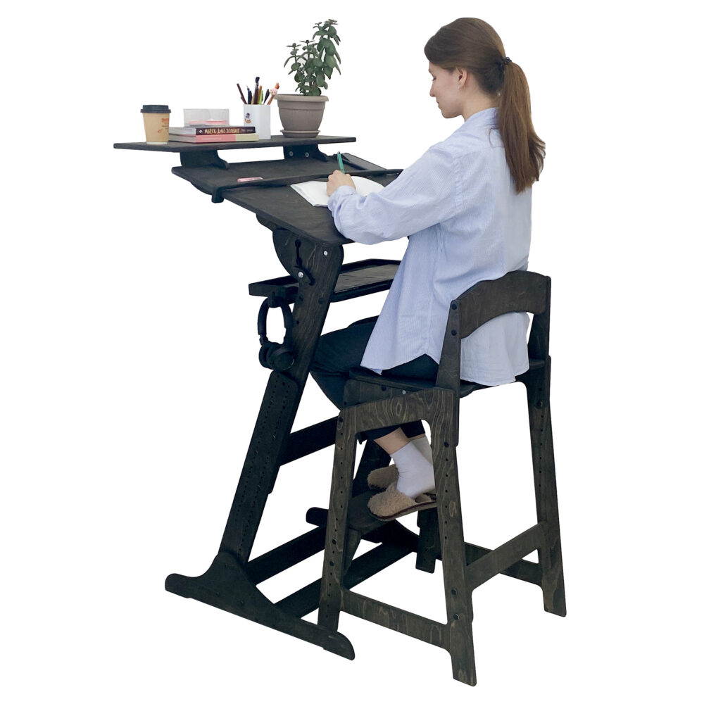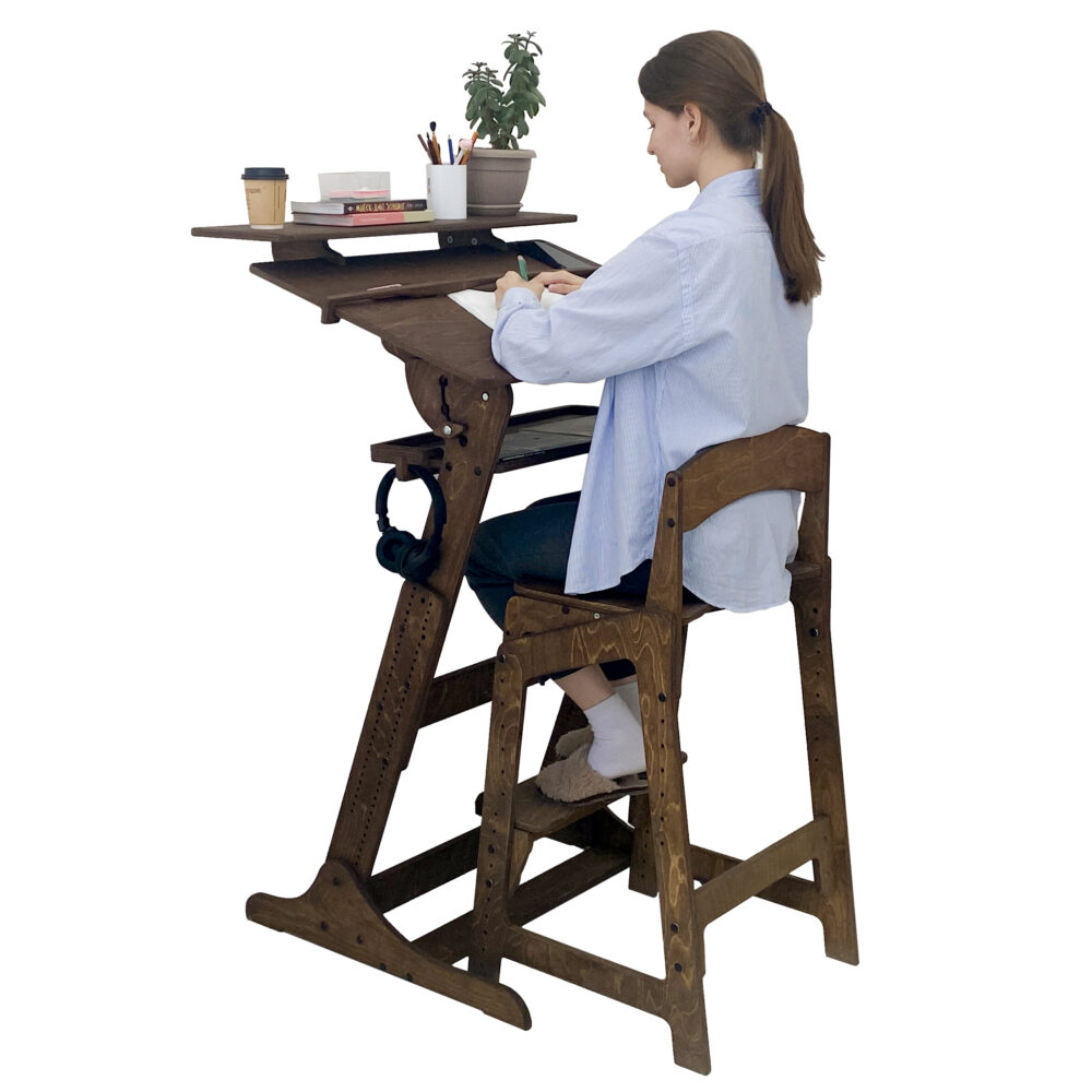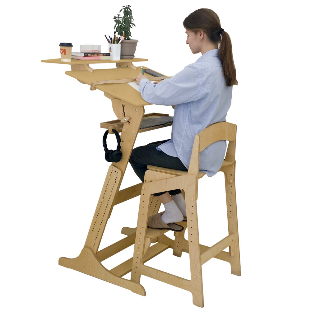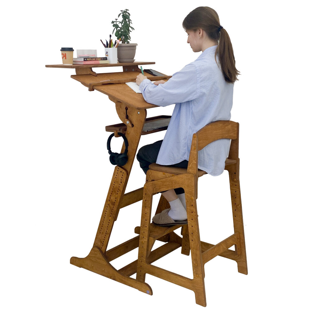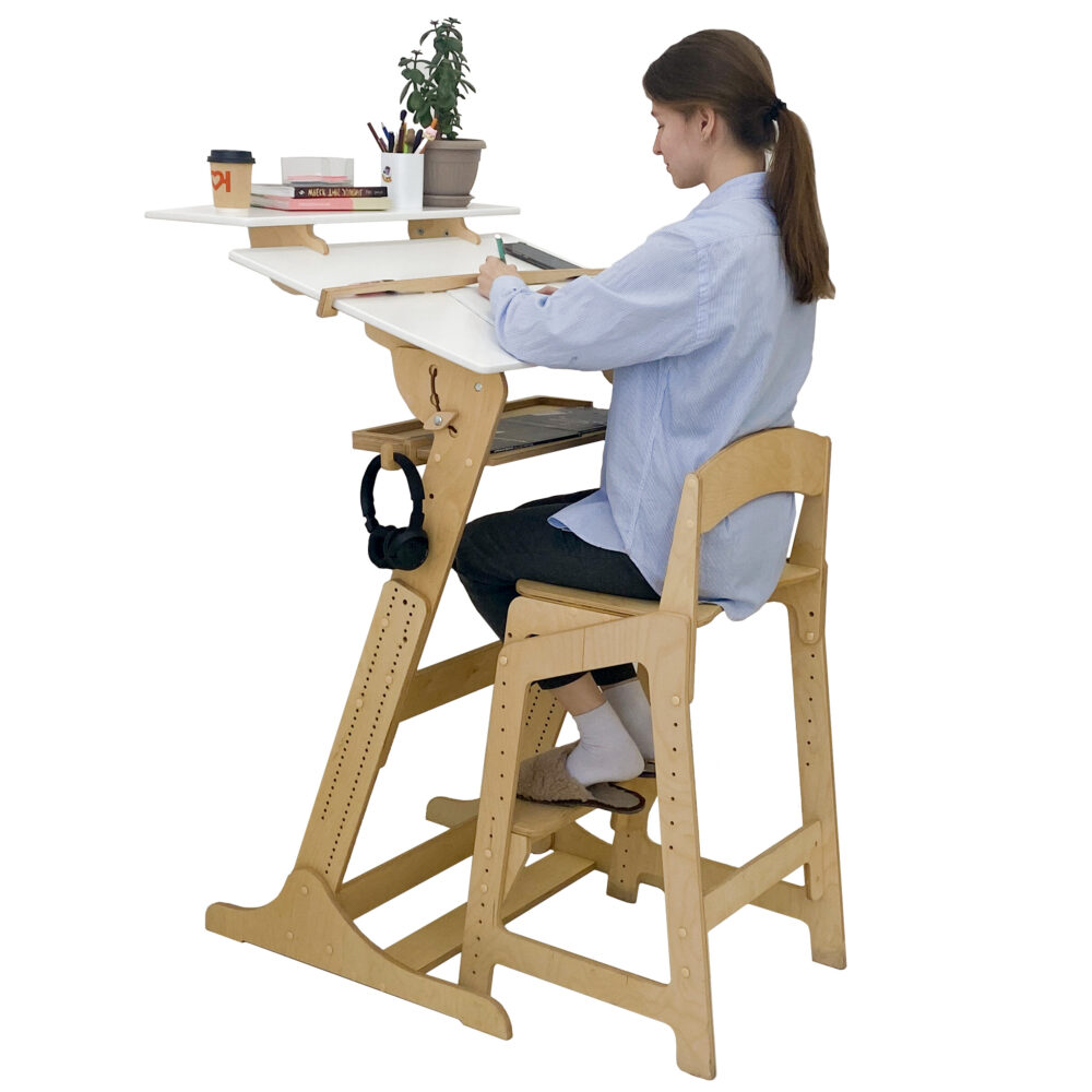 Это рабочее место оптимально для взрослых и подростков школьников. Хронос XL — стол трансформер, потому что его высоту можно регулировать на рост от 130 до 200 см. Край столешницы под наклоном 17°-34° должен находиться на уровне солнечного сплетения – это наиболее правильное положение по мнению врачей. Вам не придется менять высоту рабочего стола, чтобы присесть — используйте высокий стул. Он регулируется на рост от 140 до 180 см. Его можно использовать с любым другим столом как растущий стул для школьника или полубарный стул.